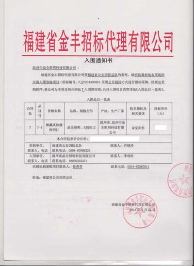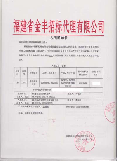 2015年4月,我公司凭借强大的自主创新能力、卓越的产品品质、优质的服务优势,在众多投标厂家中脱颖而出,成功入选为福建省消防总队“消防器材装备采购供应商入围资格”的中标单位。我们将永远向客户提供品质优良的产品和服务,用客户的口碑来作为公司长期发展的基石。