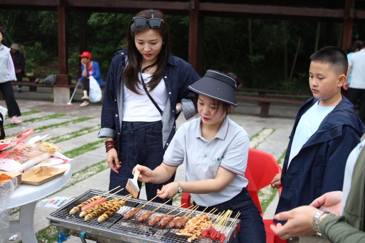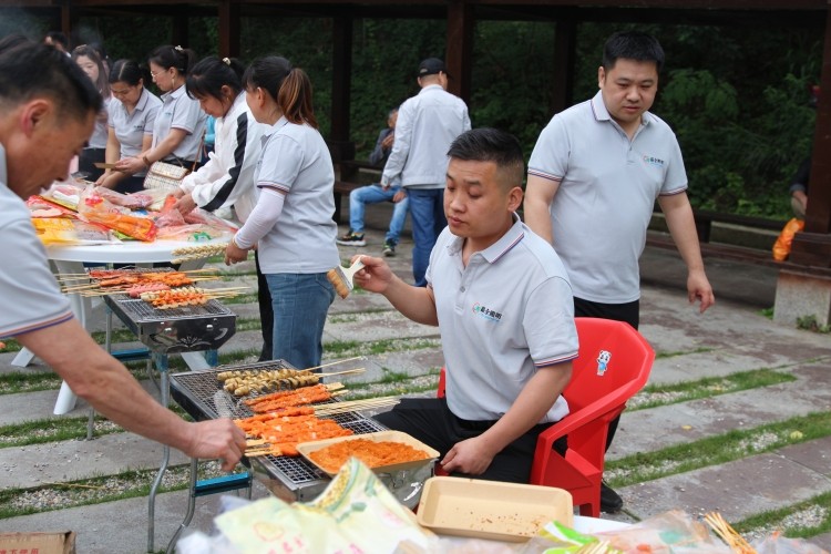 人间烟火气,烧烤恰逢时。随着团建游戏结束,大家一起前往烧烤专区。丰富的烧烤食材已经准备就绪,各小组成员井然有序地做着准备工作,新鲜的瓜果蔬菜和腌制的肉禽肉串相互搭配,宛如一幅五彩斑斓的画卷。大家纷纷展现“高超的技术”,配料、加碳、煽火、刷油、撒料……一气呵成。抬眼望去,落日余晖,映着彩霞,迎着微风,将整个天边晕染得瑰丽无比,此刻幸福和惬意有了具象化。
